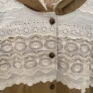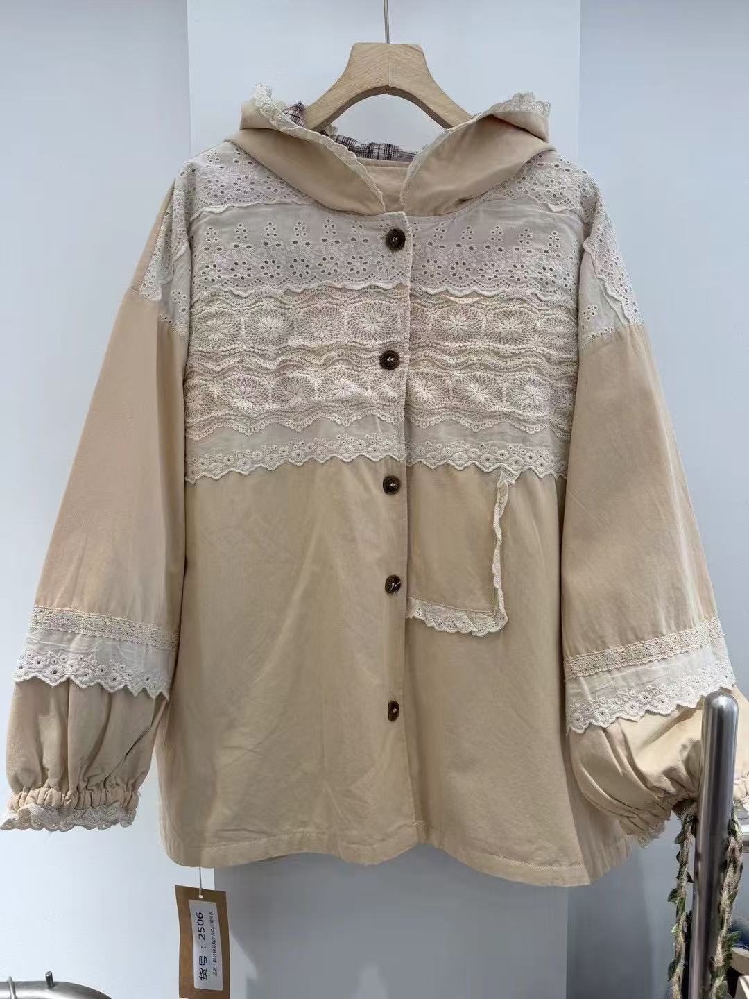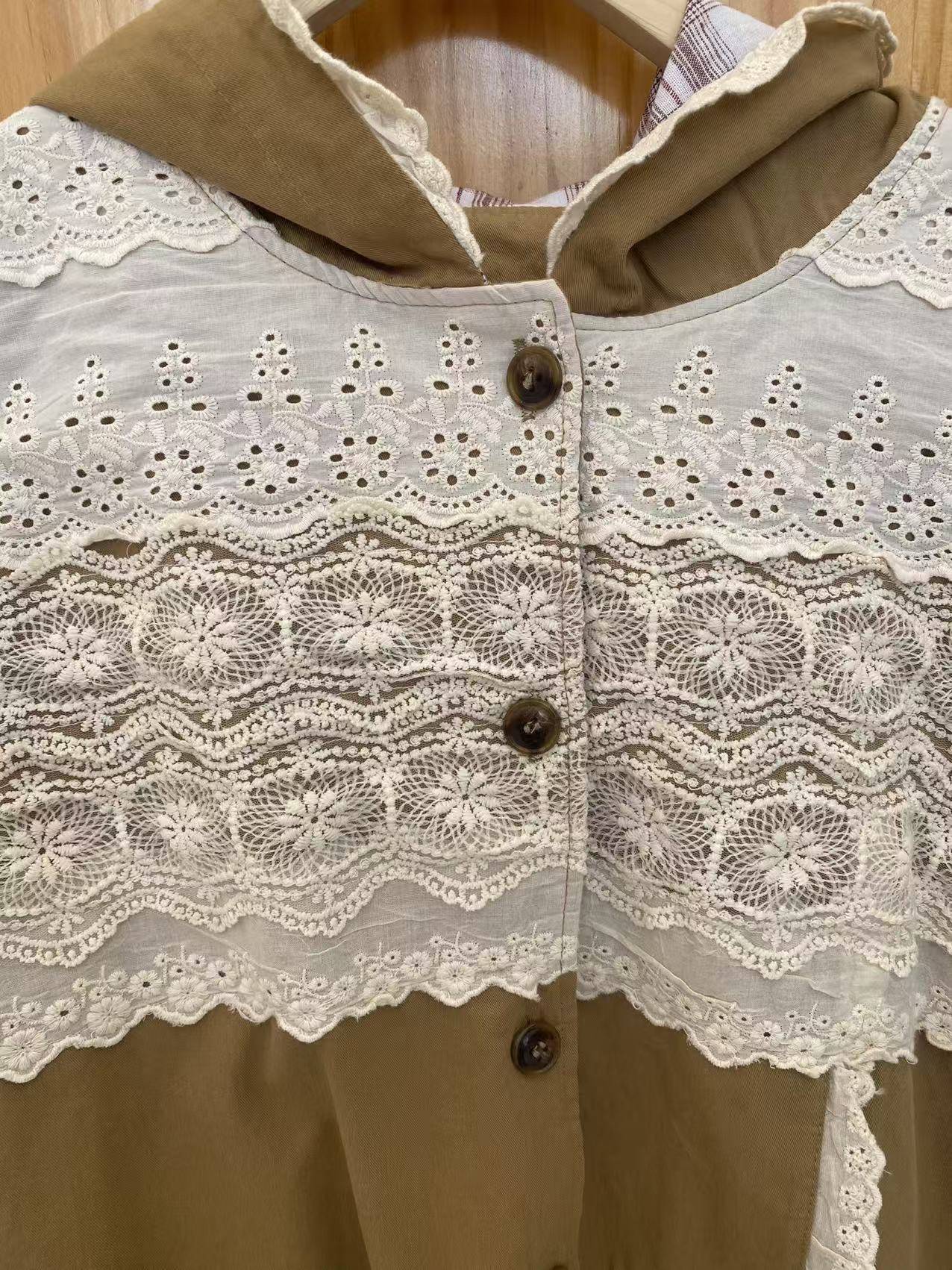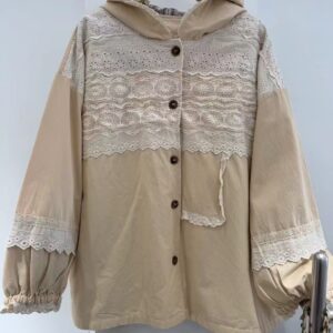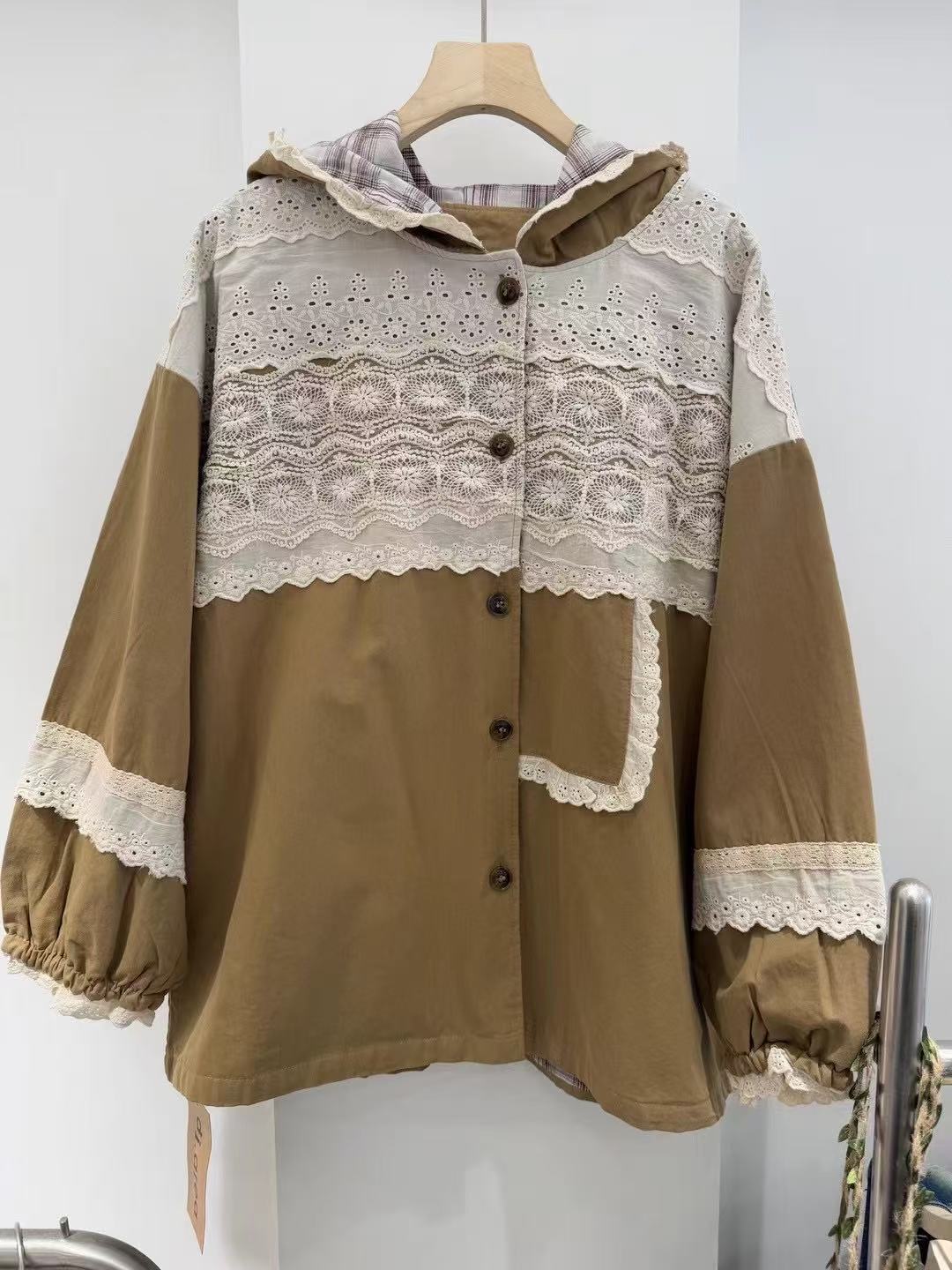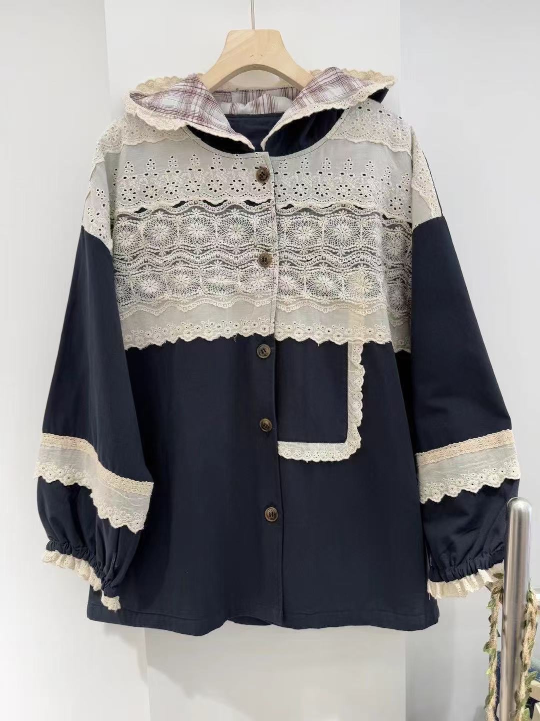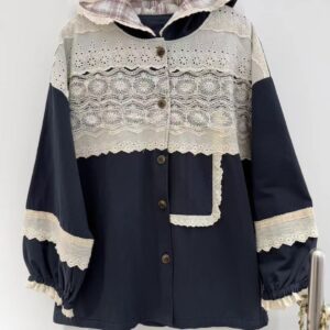 Featuring a hood, long sleeves, and a single-breasted multi-button closure, this top blends practicality with playful design. Patchwork details and appliqué elements create a subtle, whimsical aesthetic, ideal for casual wear or everyday outdoor activities.