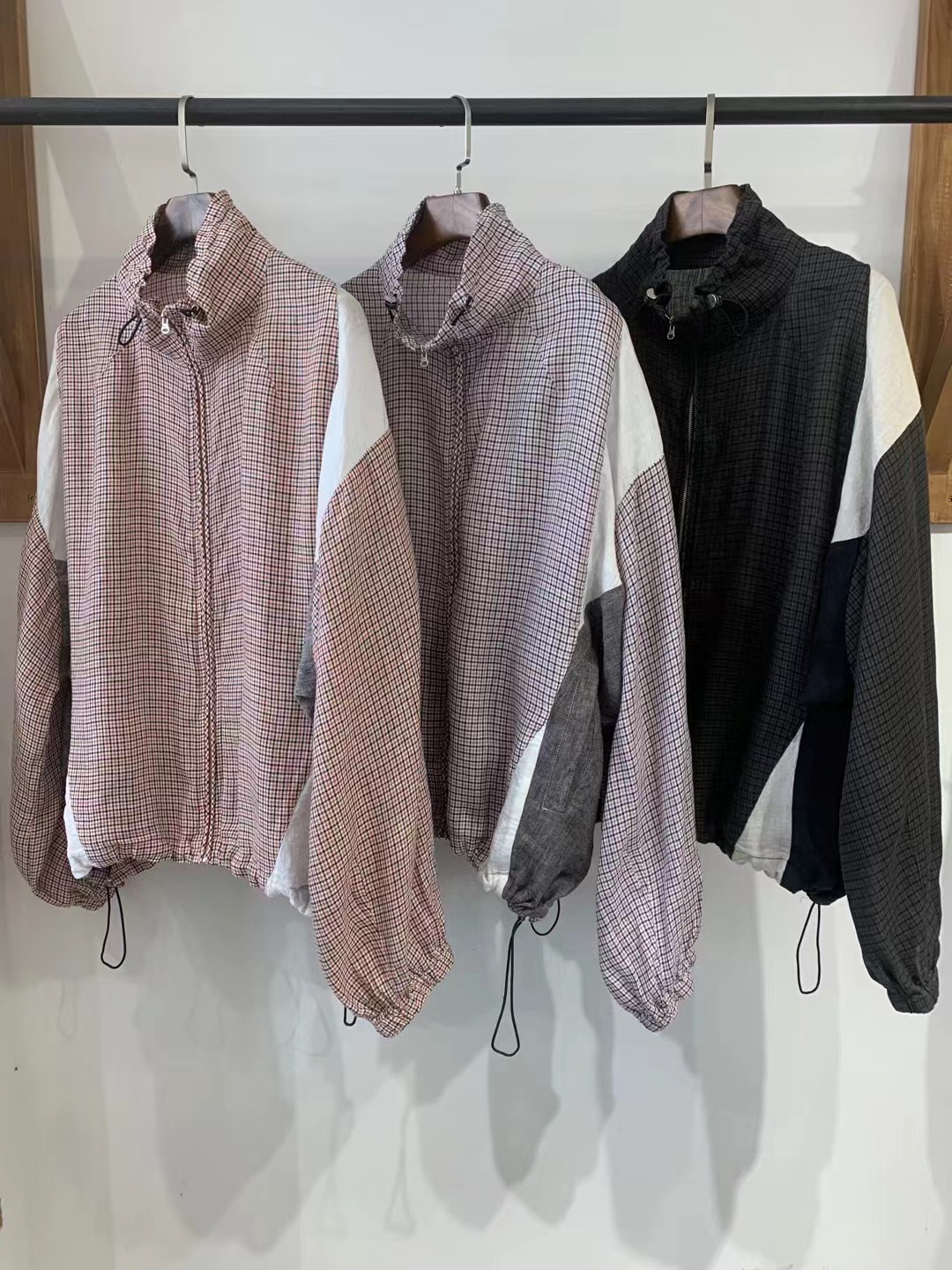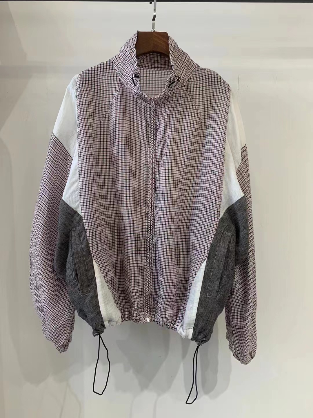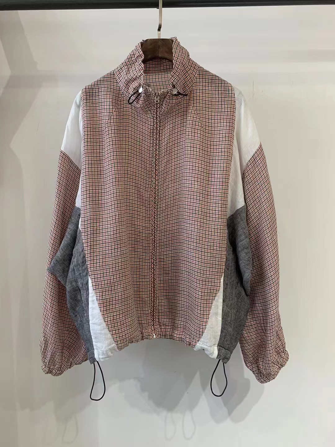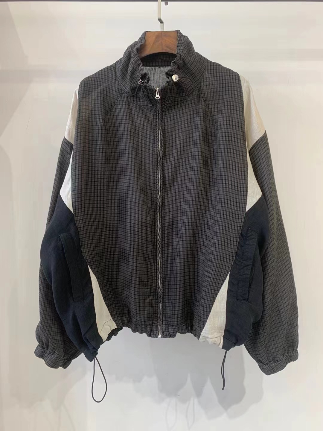 Designed with a modern half high collar, raglan long sleeves, and a front zipper closure, this piece combines practicality with style. The plaid pattern and patchwork craftsmanship add a unique, vintage-inspired touch, making it ideal for casual wear or a minimalist wardrobe.
