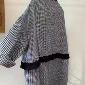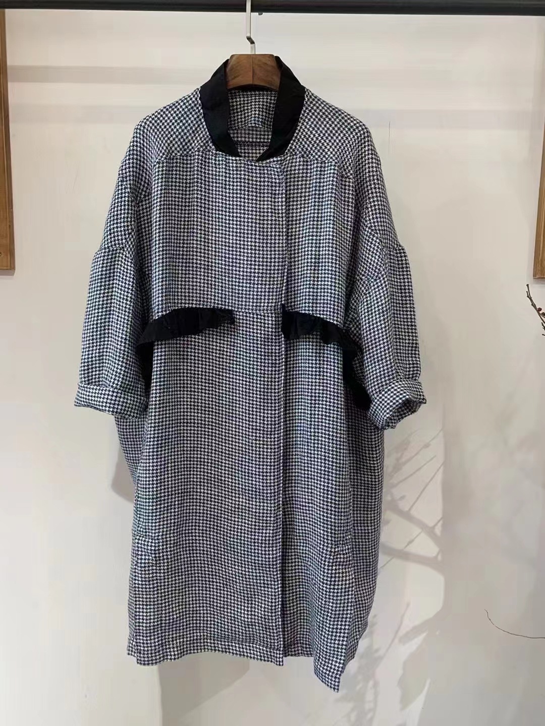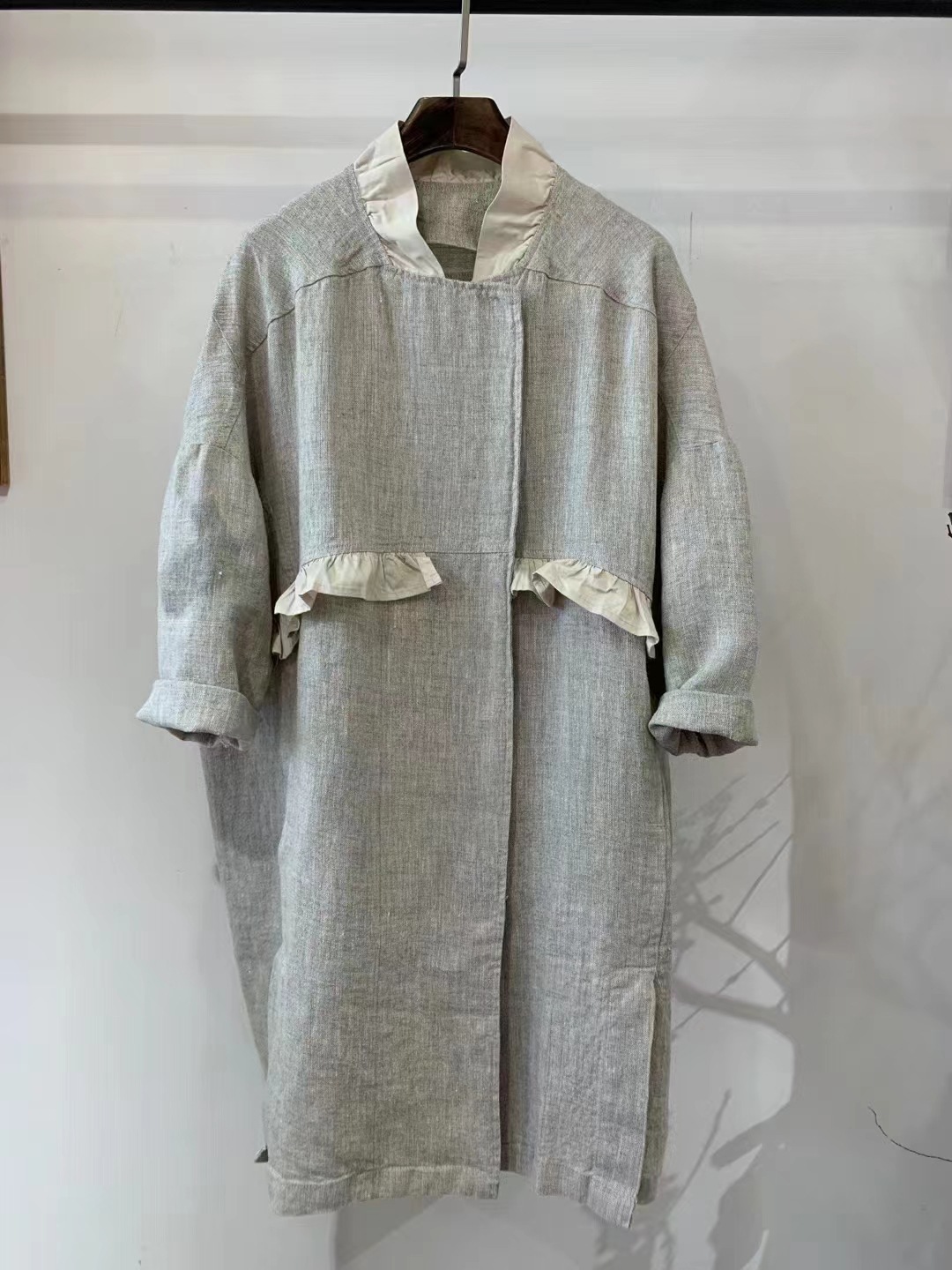 Featuring a round neckline, raglan half sleeves, and a single-breasted multi-button closure, this piece blends elegance with functionality. The ruffle details add a feminine touch, while the relaxed mid-length silhouette makes it perfect for layering or standalone styling.
